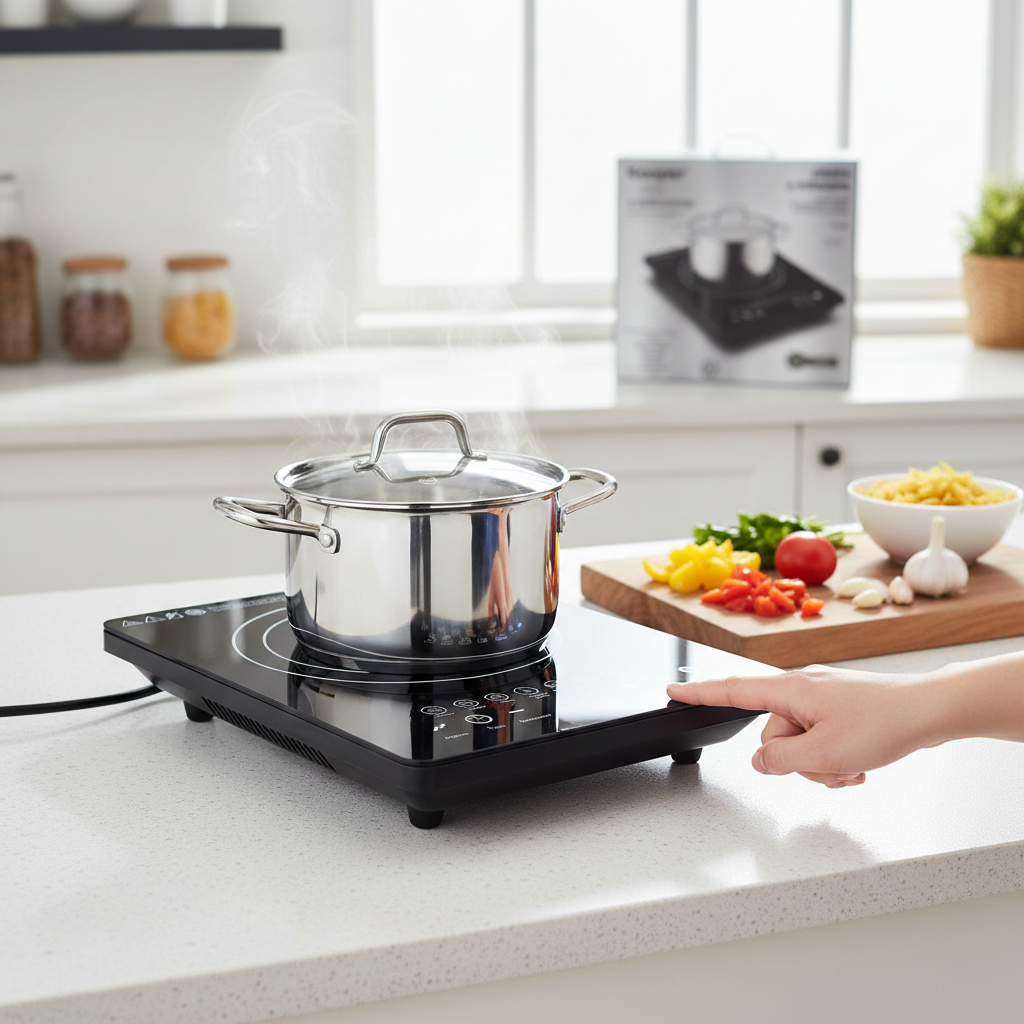 An toàn vượt trội: Bếp tự động nhận diện nồi nấu và tự ngắt khi quá nhiệt hoặc khi không có nồi trên bếp, đạt tiêu chuẩn an toàn CE khắt khe.