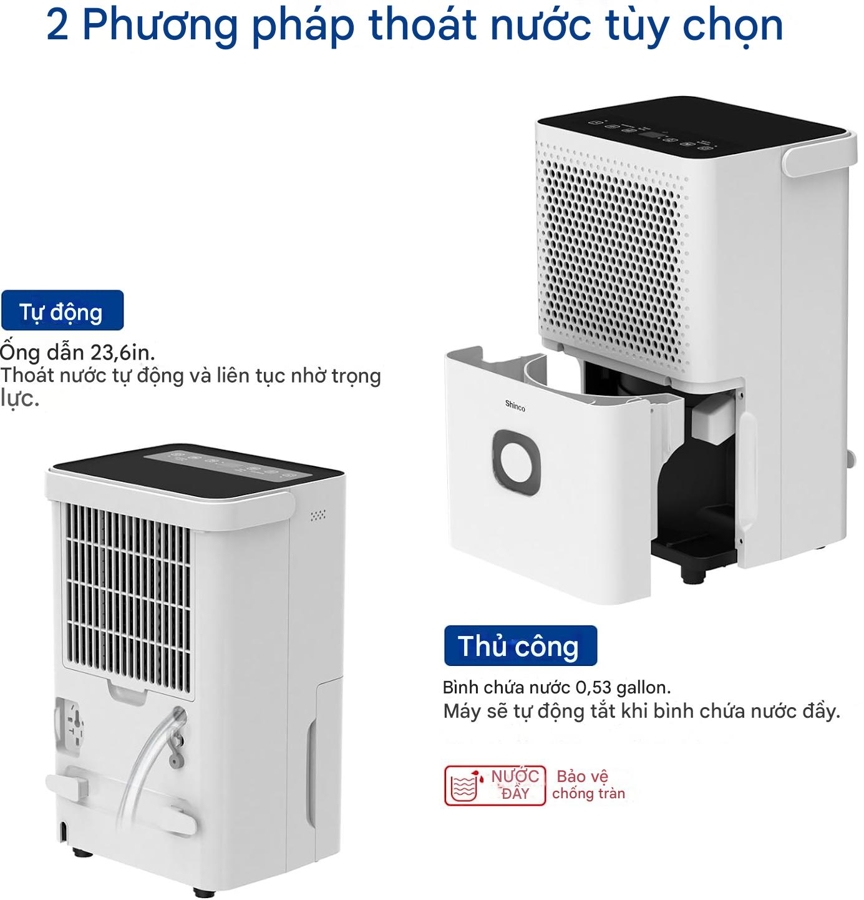 Với công suất hút ẩm lên đến 12 lít/ngày, máy nhanh chóng đưa độ ẩm phòng về mức lý tưởng. Đặc biệt, công suất tiêu thụ chỉ 165W giúp bạn thoải mái sử dụng cả ngày dài mà không lo hóa đơn tiền điện.