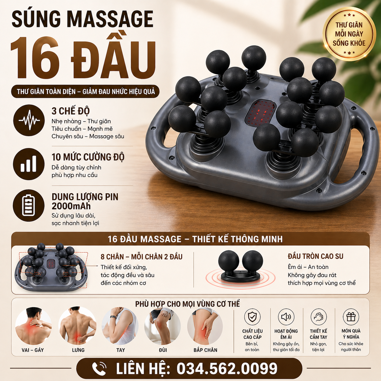 Bạn đang tìm kiếm một phương pháp phục hồi cơ thể thần tốc sau giờ làm việc căng thẳng hay những buổi tập luyện cường độ cao? Máy mát xa cầm tay 16 đầu thế hệ mới chính là "trợ lý" sức khỏe hoàn hảo, giúp đánh tan mọi cơn đau nhức, tê mỏi chỉ trong vài phút.
