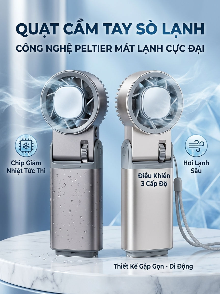 Công Nghệ Sò Lạnh Cấp Tốc: Điểm khác biệt lớn nhất chính là tấm làm mát (sò lạnh) tích hợp. Chỉ cần một chạm, bề mặt quạt sẽ giảm nhiệt sâu, giúp bạn hạ nhiệt tức thì khi áp vào da (cổ, trán, tay).