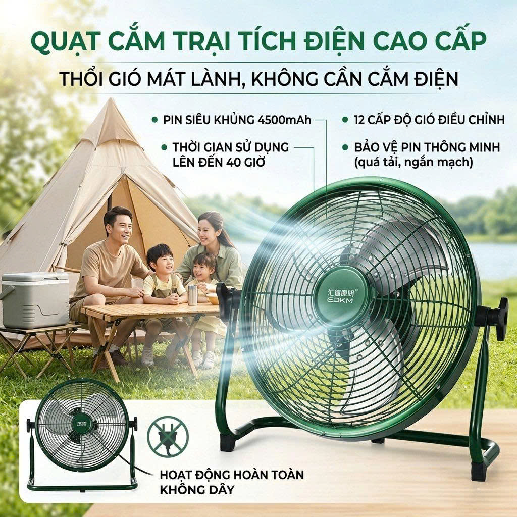Được trang bị viên pin Lithium cao cấp dung lượng 4500mAh, quạt EDKM có khả năng hoạt động liên tục từ 4 đến 40 giờ (tùy vào cấp độ gió bạn chọn). Chỉ cần sạc đầy một lần, bạn có thể yên tâm sử dụng suốt đêm hoặc cả một ngày dài dã ngoại mà không lo hết pin giữa chừng.