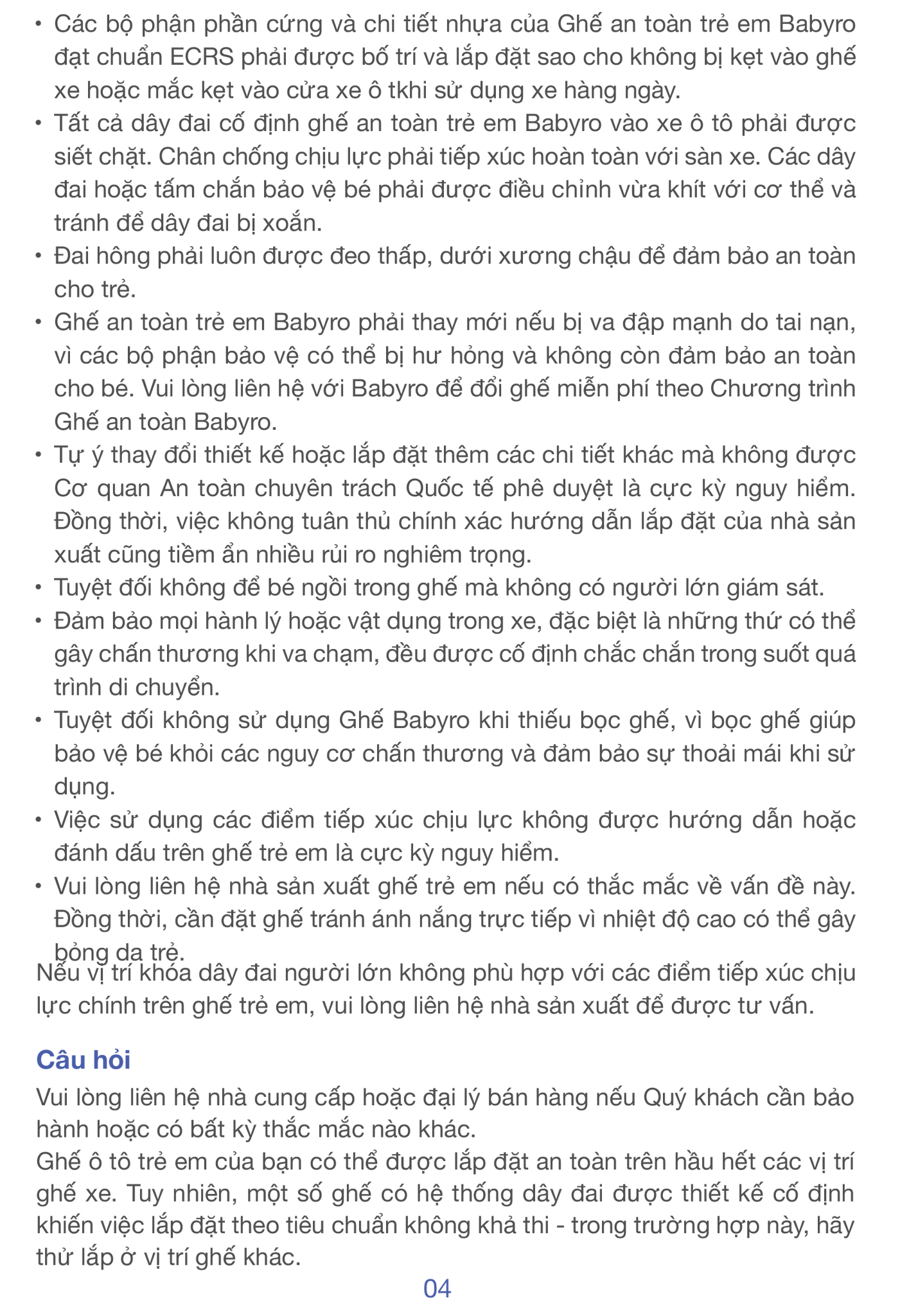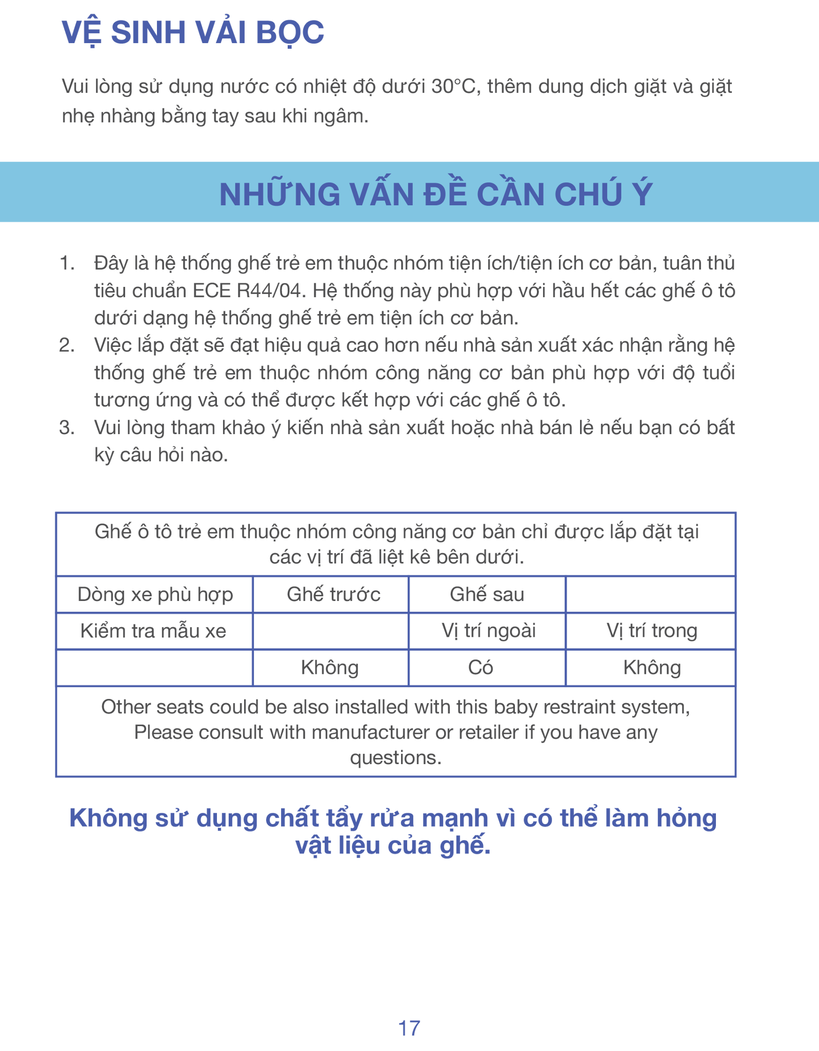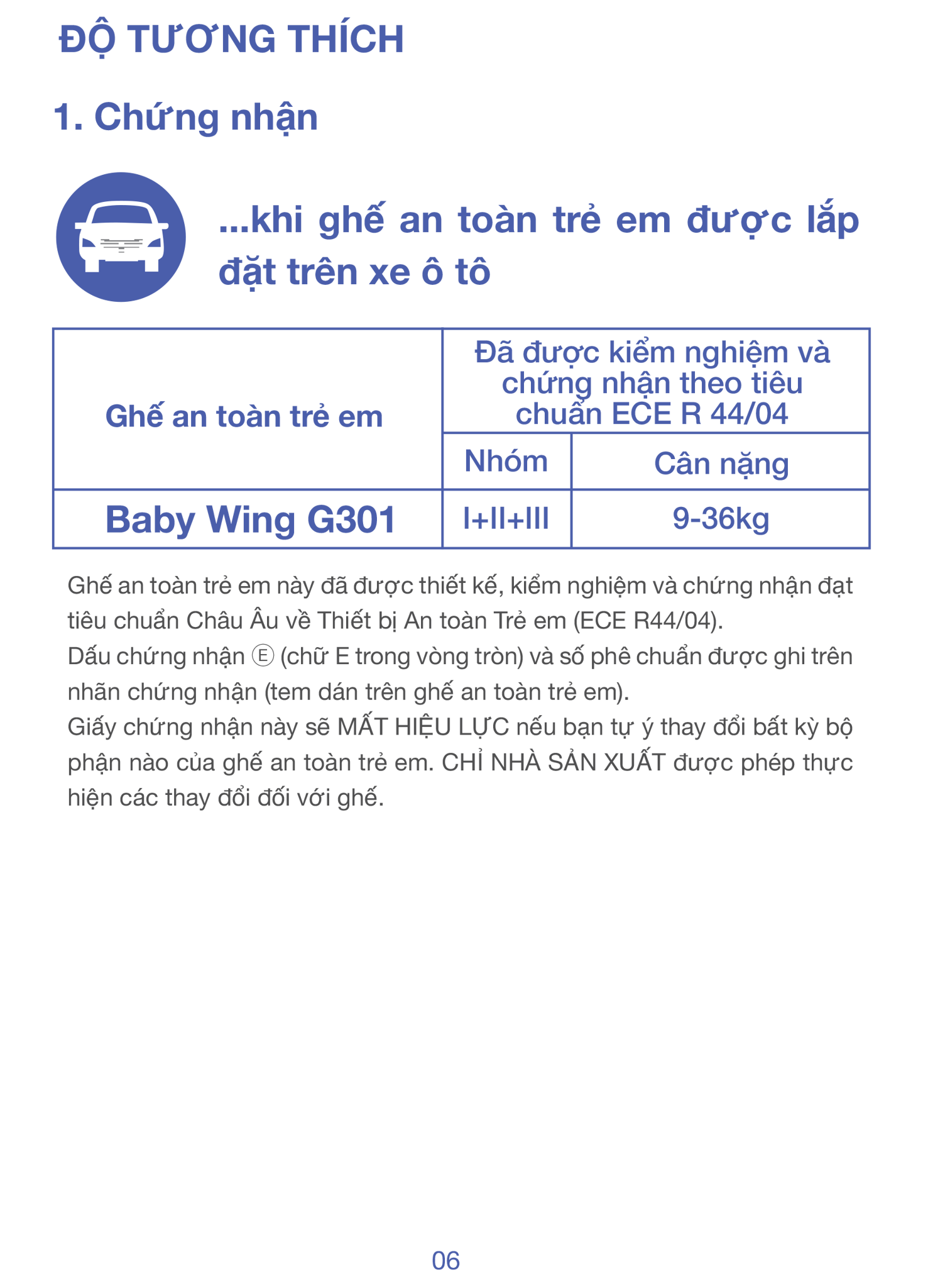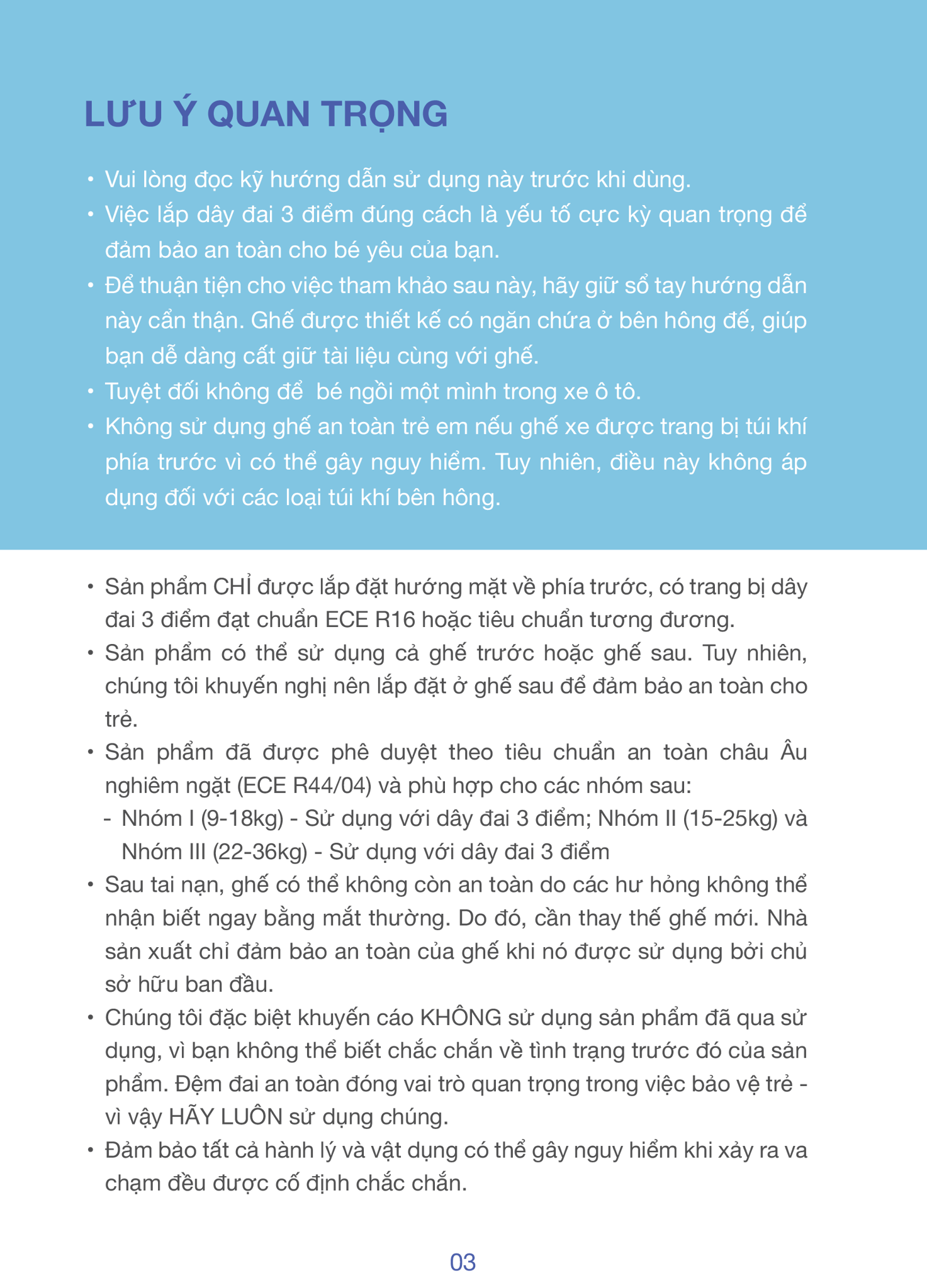 | Tiêu chuẩn an toàn | ECE R44 |