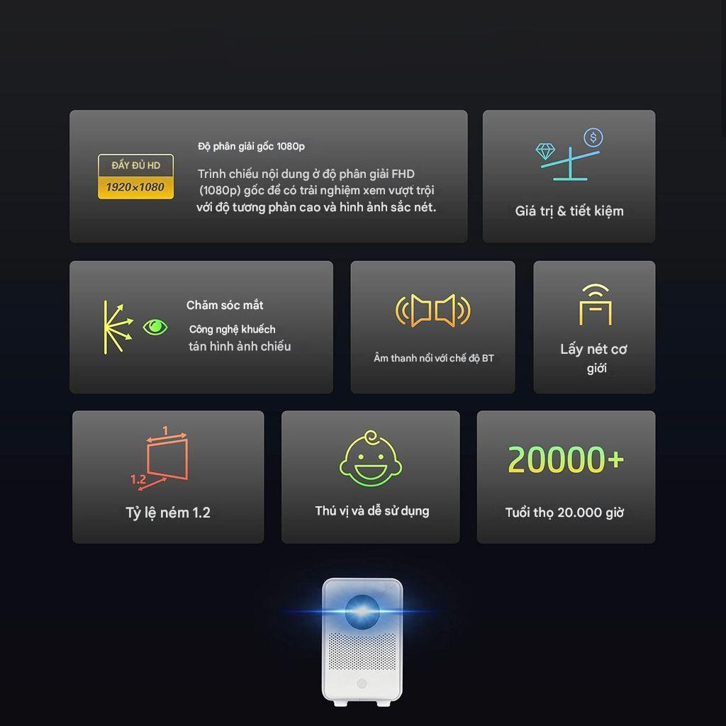Độ bền cực cao: Nguồn sáng LED tuổi thọ hơn 20.000 giờ. Nếu mỗi ngày bạn xem 1 bộ phim 3 tiếng, máy có thể đồng hành cùng bạn hơn 18 năm!