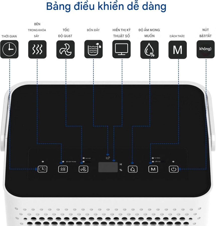 Bảng điều khiển thông minh: Tích hợp hẹn giờ, điều chỉnh độ ẩm tự động và chế độ khử khuẩn không khí.