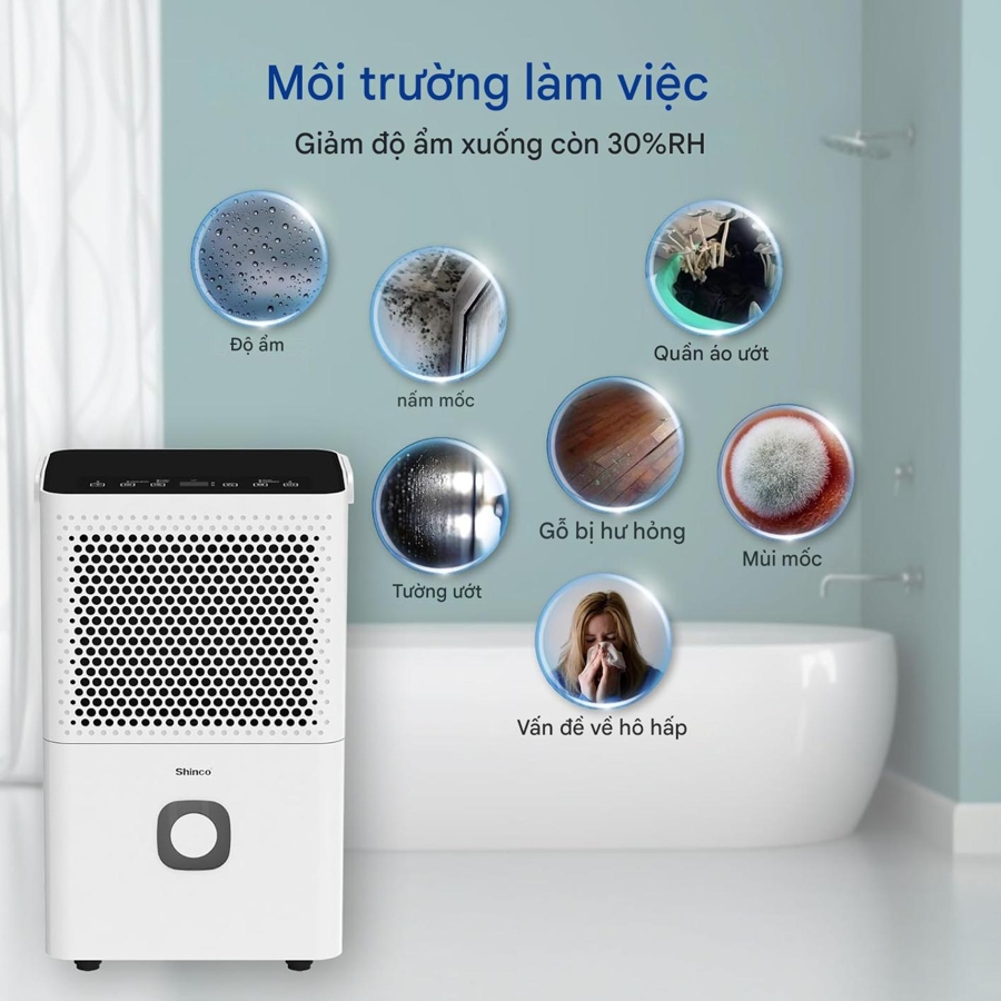 Không chỉ hút ẩm, Shinco CF12BD/L3 còn hỗ trợ loại bỏ vi khuẩn và mùi ẩm mốc, trả lại bầu không khí trong lành, bảo vệ hệ hô hấp cho cả gia đình.