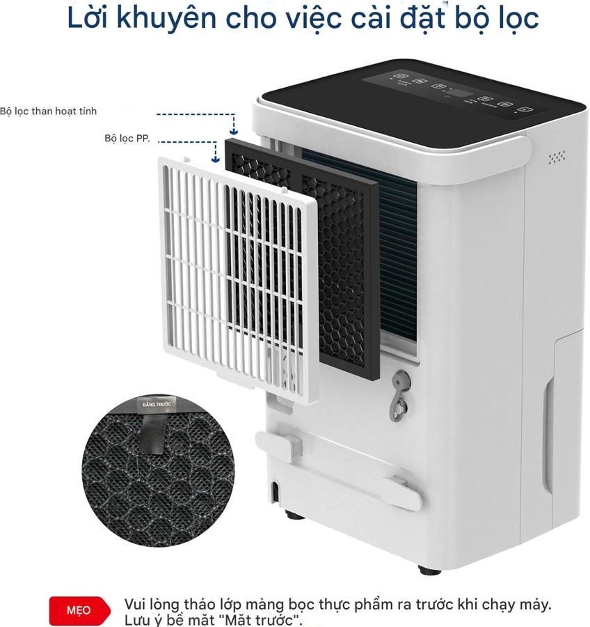 Với công suất hút ẩm lên đến 12 lít/ngày, máy nhanh chóng đưa độ ẩm phòng về mức lý tưởng. Đặc biệt, công suất tiêu thụ chỉ 165W giúp bạn thoải mái sử dụng cả ngày dài mà không lo hóa đơn tiền điện.
