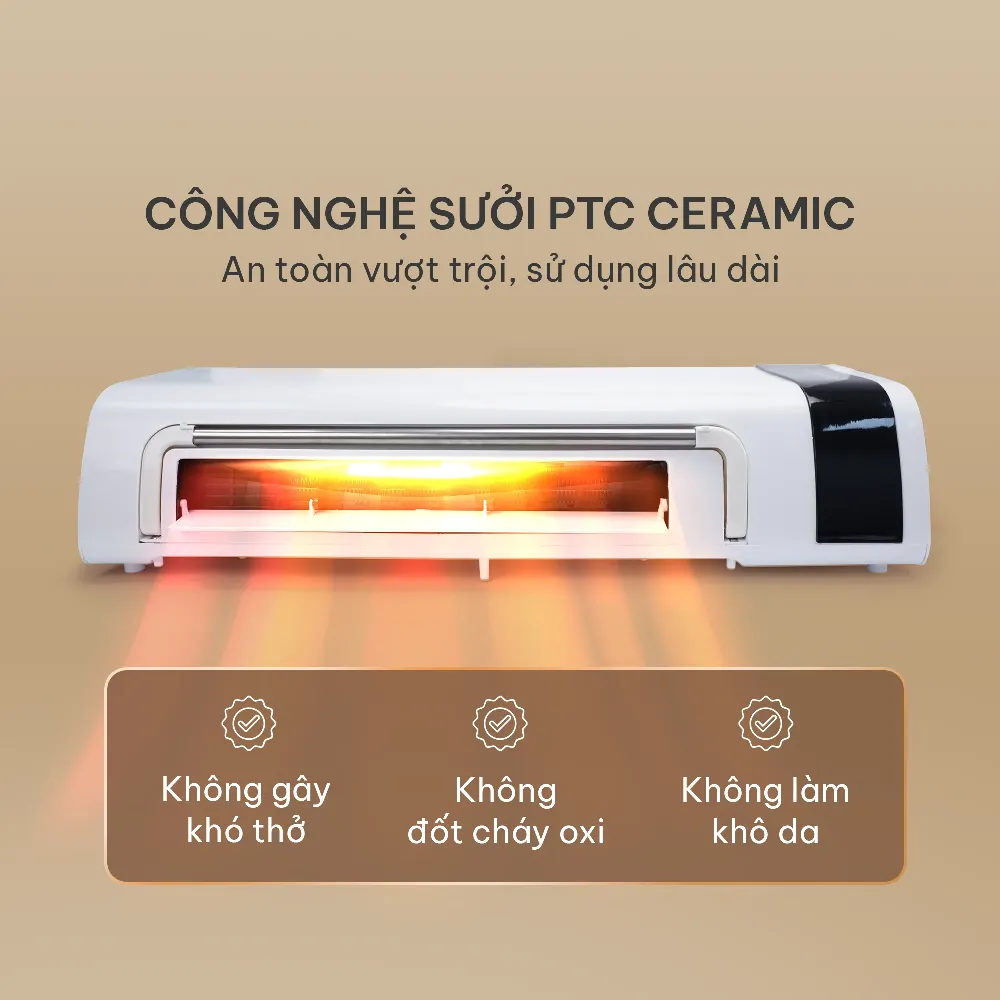 - Không gây khó thở: Khác với các loại máy sưởi truyền thống dễ tạo cảm giác bí bách, công nghệ PTC Ceramic tỏa nhiệt đều và ổn định, không đốt cháy bụi hay làm khô không khí, giúp bạn hít thở dễ dàng hơn.