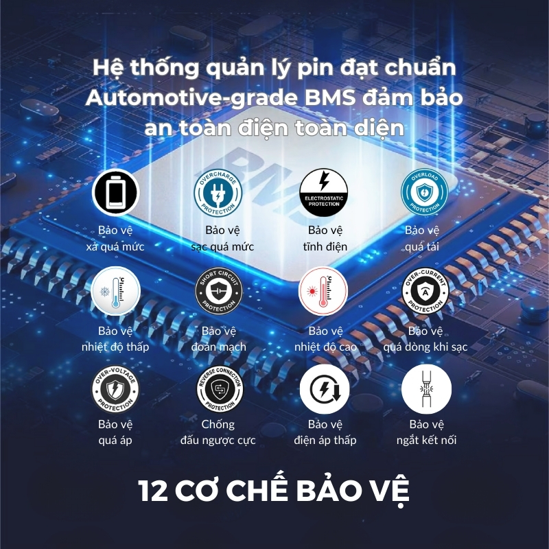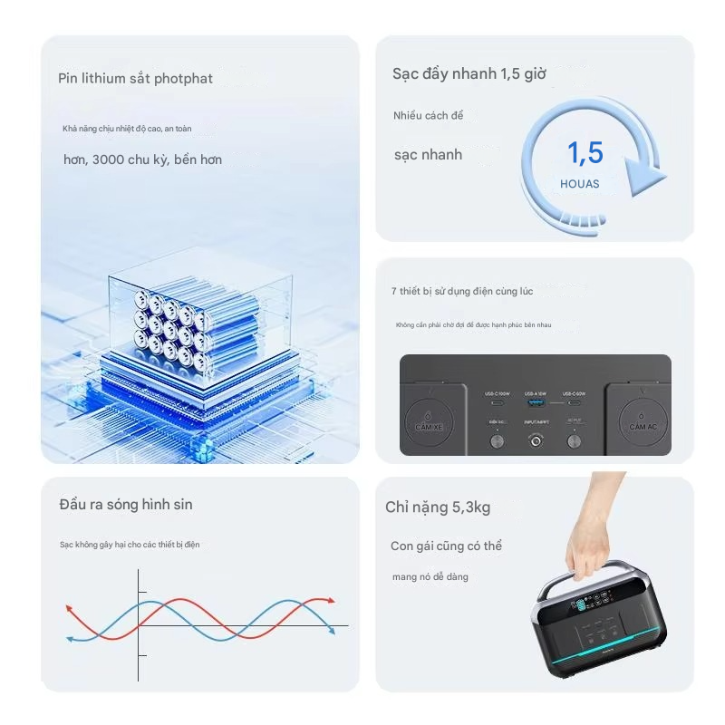 • Loại pin: Pin Lithium Iron Phosphate (LiFePO4), tuổi thọ 3500 chu kỳ (>80% dung lượng)