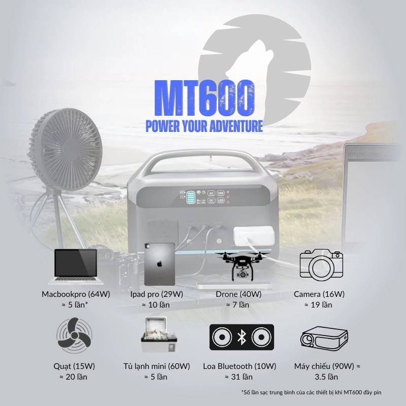 • AC Output: 220V~50Hz, 600W (Công suất đỉnh 1200W)