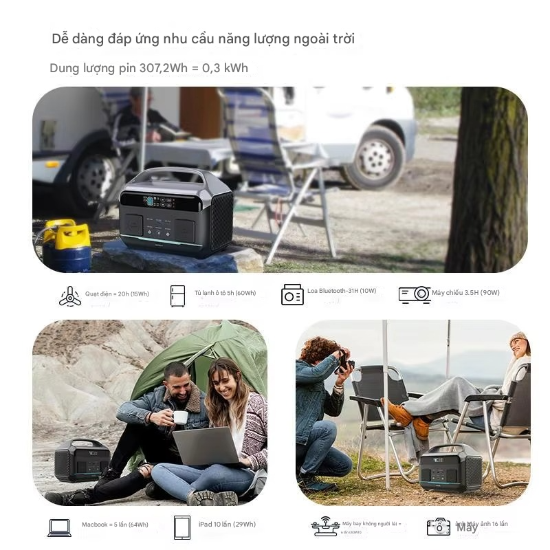 Công suất đầu ra: | • AC Output: 220V~50Hz, 600W (Công suất đỉnh 1200W) • DC Output: 12V=5A Max (Chia sẻ với cổng tẩu thuốc xe hơi) • USB-C1: 5V=3A / 9V=3A / 12V=3A / 15V=3A / 20V=5A (Max 100W) • USB-C2: 5V=3A / 9V=3A / 12V=3A / 15V=3A / 20V=3A • USB-A: 5V=3A / 9V=2A / 12V=1.5A (Max 18W) |